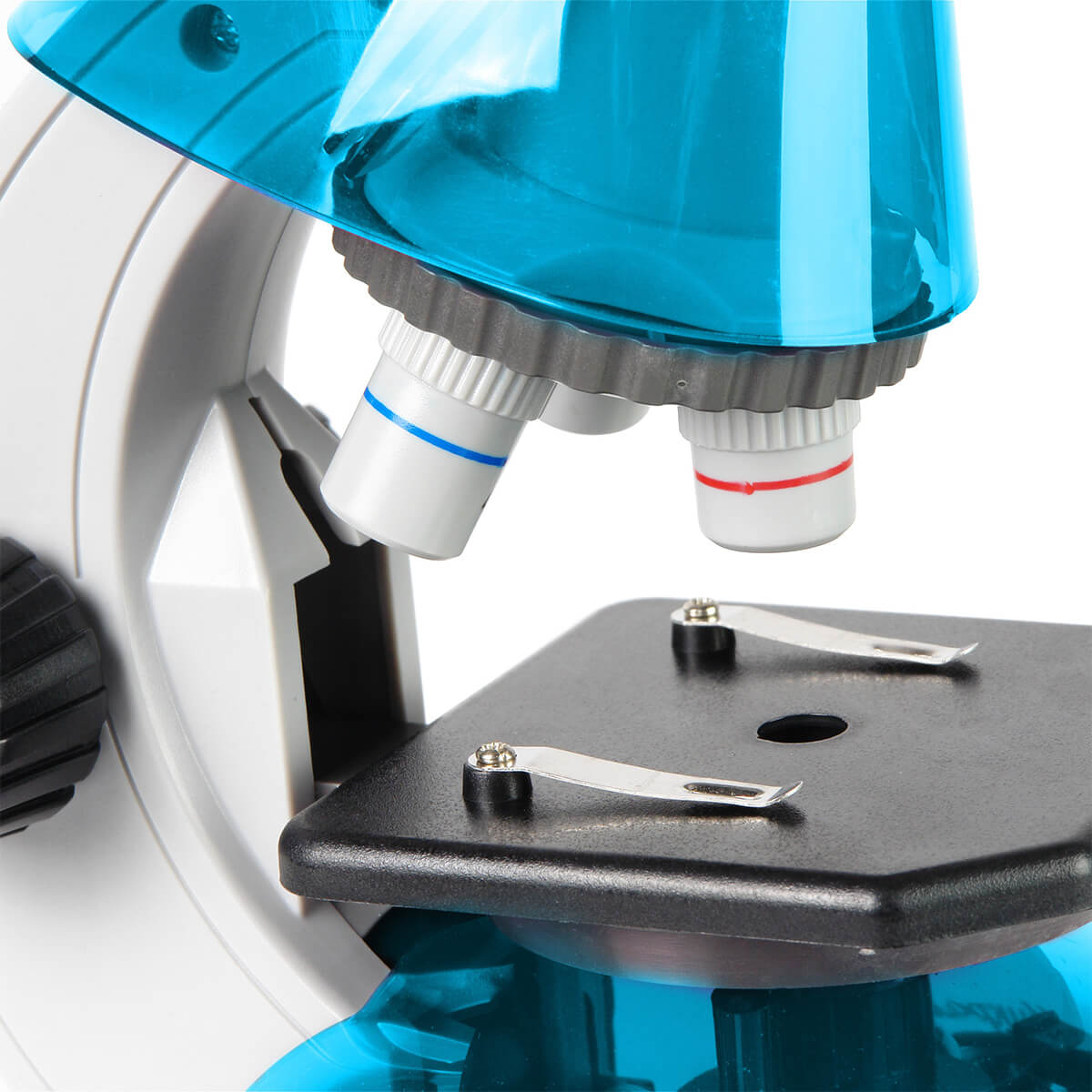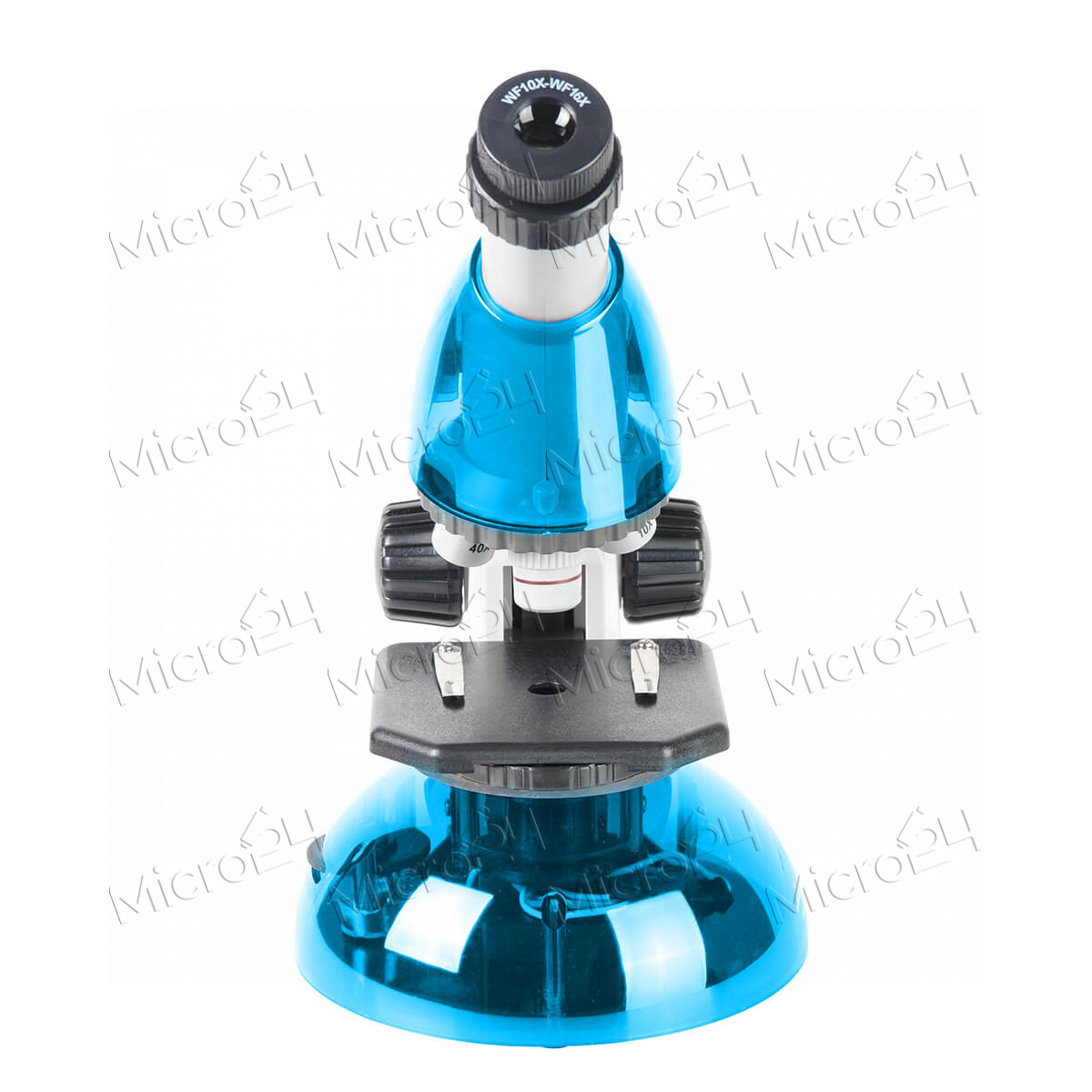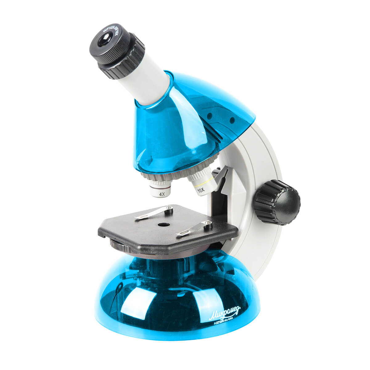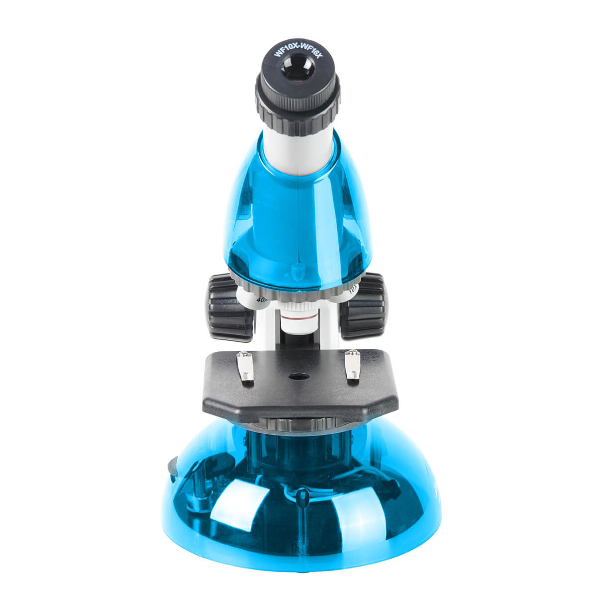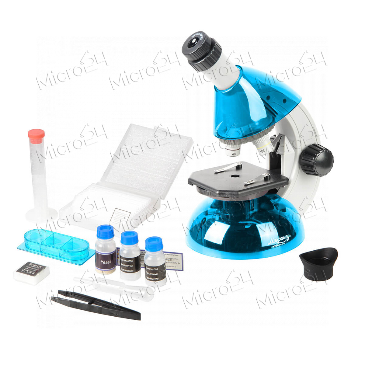 Оптический прибор с увеличением 40x-640x. Предусмотрен круглый предметный столик с регулируемой светодиодной подсветкой и набором диафрагм. Револьверное поворотное устройство рассчитано на три объектива с масштабированием 4, 10, 40 крат. Микроскоп работает от двух пальчиковых батареек, что позволяет проводить опыты даже на улице. Насадка монокулярного типа может наклоняться на 45 градусов. В комплектацию входят предметные и покровные стекла, мензурка с мерными делениями, емкость, наклейки, пинцет, пипетка и флакон.
